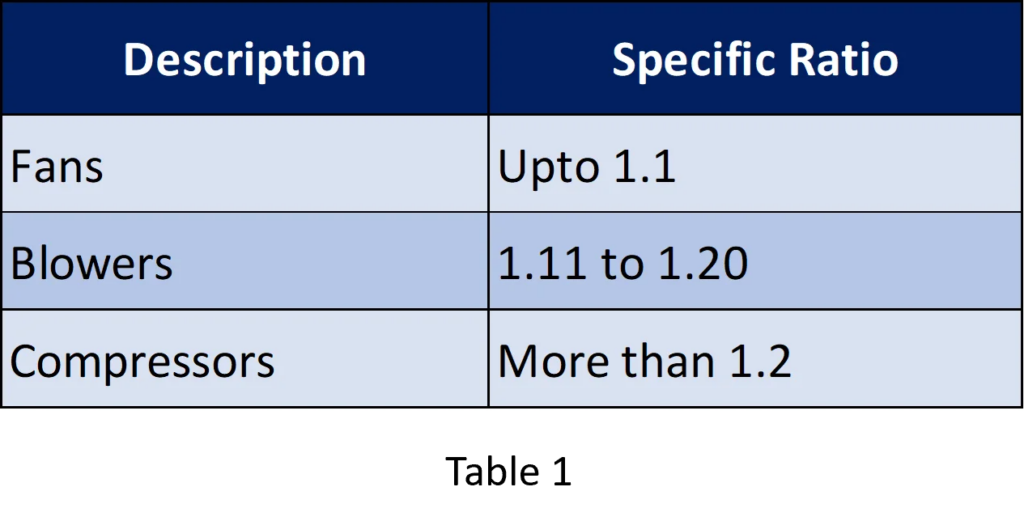 Fans, blowers and compressors are differentiated by the method used to move the air, and by the system pressure they must operate. As per American Society of Mechanical Engineers (ASME) the specific ratio (i.e) the ratio of the discharge pressure over the suction pressure is used for defining or differentiating the fans, blowers and compressors. The following tabular column explains it better.
