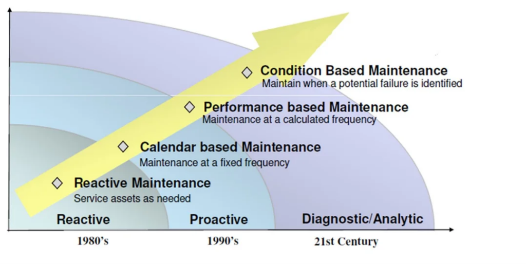 Failures can be detected by a variety of diagnostic methods. Among the various techniques used in predictive maintenance, vibration analysis has emerged as a valuable tool. Following figure explains the evolution of maintenance practices.